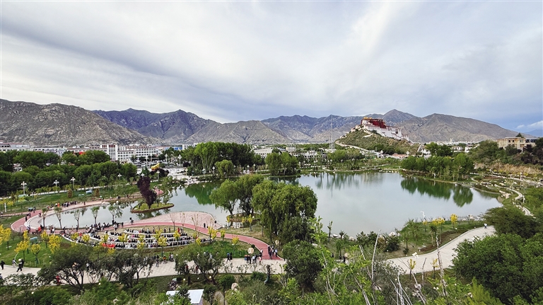 拉薩團(tuán)結(jié)公園坐落于布達(dá)拉宮西麓、藥王山腳下。昔日,這里房屋高低錯雜、線纜交錯密布、市場喧鬧擁擠、環(huán)境喧囂擾攘,不僅影響城市形象和生態(tài)環(huán)境,還影響出行游玩體驗。如今,湖水如碧綢般清澈,岸邊綠樹成蔭,各類花卉競相綻放,昔日雜亂之地已蛻變?yōu)轸浯涿髦?,人文古跡與自然景致相映成趣,共同繪就出“百澤繞城·水城相依”的生態(tài)文明畫卷。