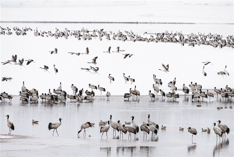 近年來,隨著自駕游客的日益增多,生態(tài)保護也面臨著新的課題。去年,申扎縣專門組建了“雪之傲影”團隊,打造一支專業(yè)生態(tài)保護尖兵,構(gòu)建“空中無人機巡航+地面智能檢測+隊員徒步巡邏”的全方位防護網(wǎng)絡(luò)。同時,每年重點時期開展“保護黑頸鶴家園”主題宣講等,展示展出色林錯國家級自然保護區(qū)內(nèi)的珍稀野生動物影像資料,向游客宣傳野生動物保護知識。