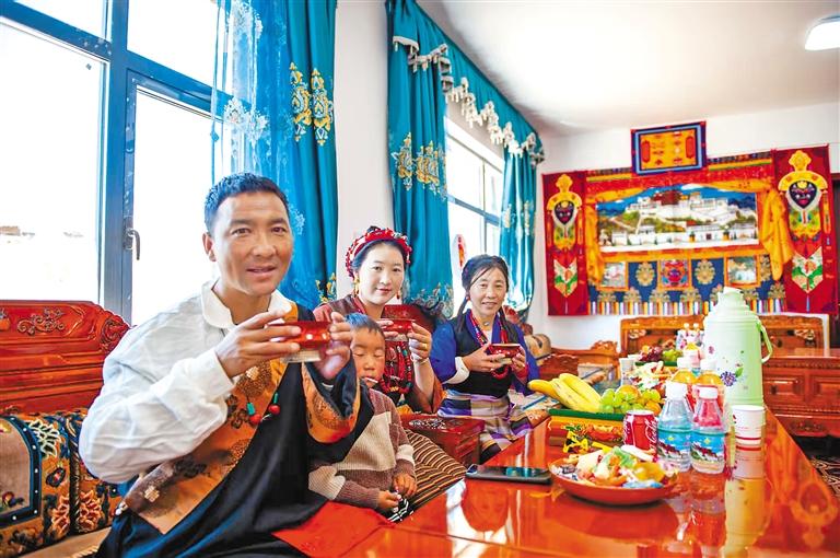 定結(jié)縣乃村村民在喝新房里的第一杯酥油茶。記者 旦增嘎瓦 攝