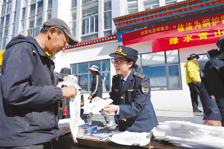 在法規(guī)宣講環(huán)節(jié),工作人員通過設(shè)立宣傳展板、懸掛宣傳橫幅、發(fā)放政策法規(guī)手冊(cè)、現(xiàn)場接受群眾咨詢答疑等形式,向群眾集中宣傳《中華人民共和國青藏高原生態(tài)保護(hù)法》及自治區(qū)實(shí)施辦法等生態(tài)環(huán)保法律法規(guī)。