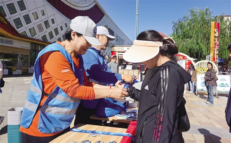 志愿者為市民系上象征保護生態(tài)環(huán)境的藍(lán)絲帶。