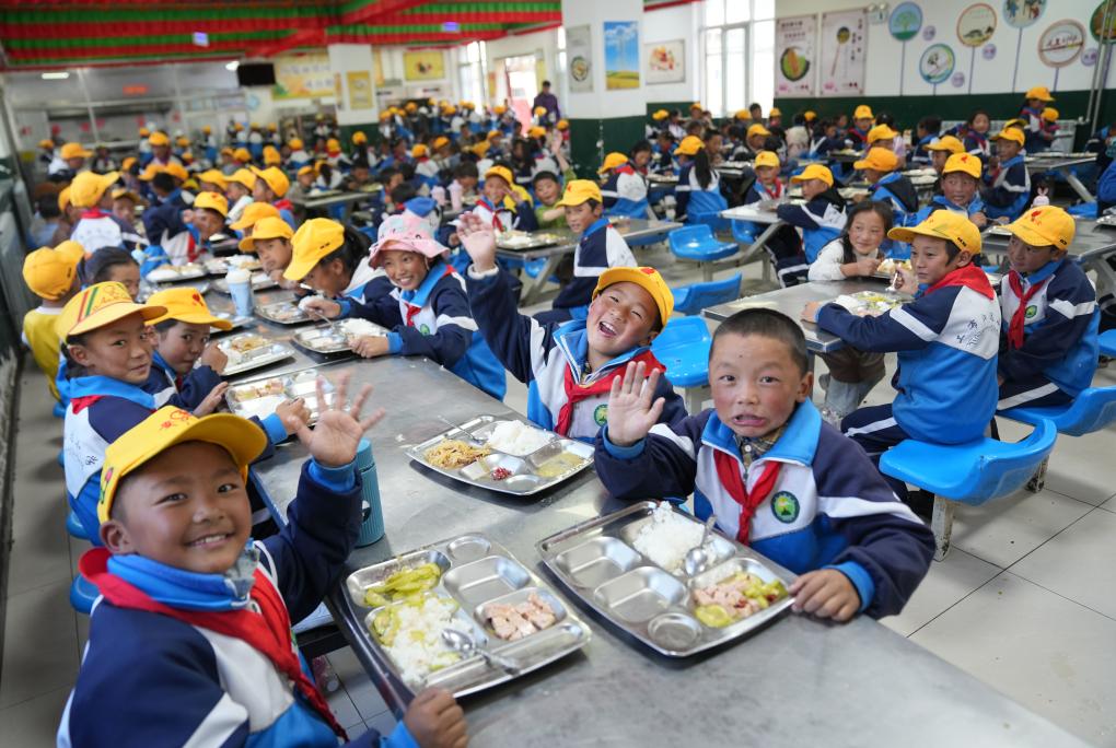 2024年9月3日,西藏林芝市工布江達(dá)縣娘蒲鄉(xiāng)中心小學(xué)的學(xué)生們?cè)谙碛梦绮?。新華社記者 晉美多吉 攝