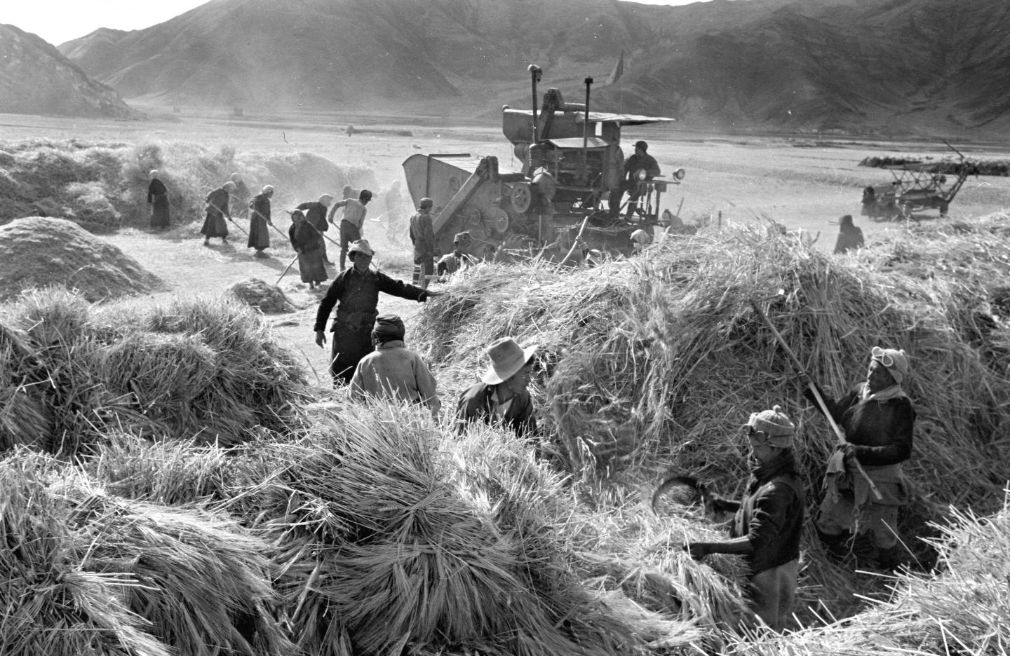 1965年,堆龍德慶縣(現(xiàn)為堆龍德慶區(qū))南崗鄉(xiāng)互助組組員們?cè)谑崭钋f稼。新華社記者 吳祖政 攝