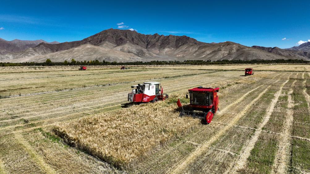 2022年9月19日,西藏日喀則市江孜縣熱索鄉(xiāng)努康村農(nóng)機(jī)合作社的村民集中對(duì)村里三千多畝耕地進(jìn)行機(jī)械化收割。新華社記者 晉美多吉 攝