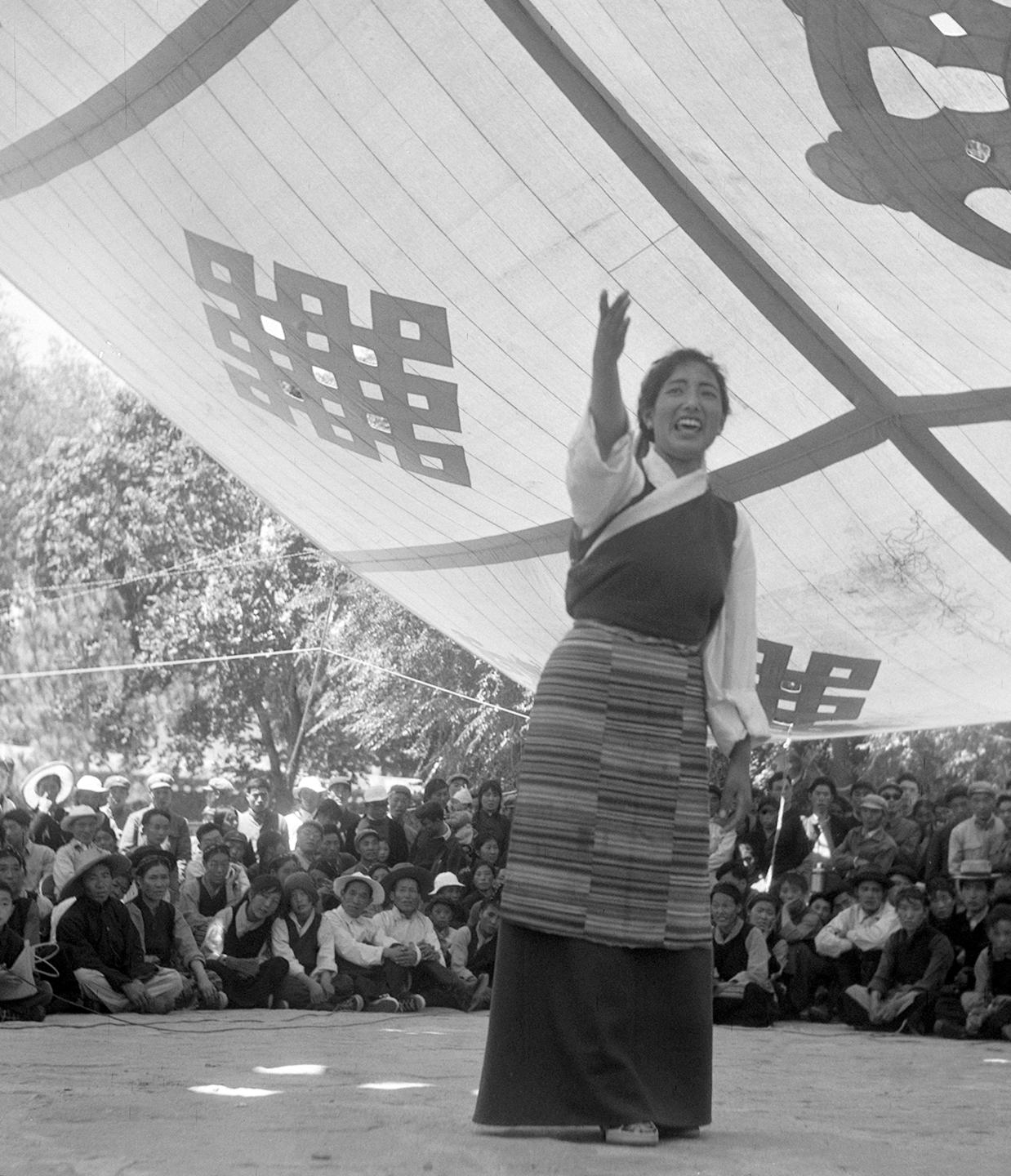 1965年10月,在西藏拉薩各族各界群眾慶祝自治區(qū)成立聯(lián)歡會(huì)上,西藏文化工作隊(duì)隊(duì)員雍西在演出。新華社記者 林楓 攝