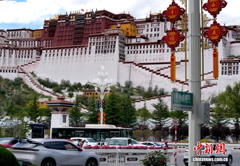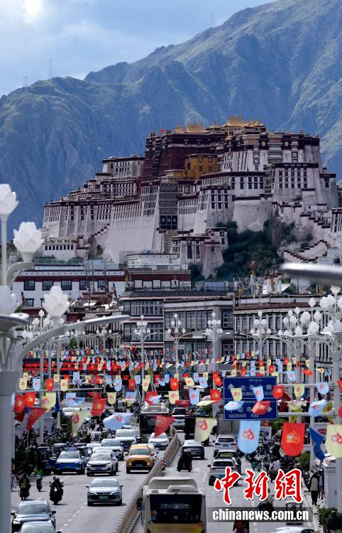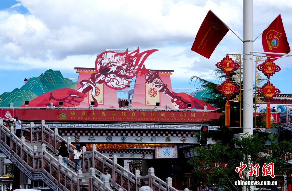 8月19日,隨著西藏自治區(qū)成立60周年慶?;顒?dòng)臨近,拉薩氛圍濃。拉薩街頭,處處是張燈結(jié)彩的盛景,洋溢著一派祥和與歡騰的氛圍。圖為拉薩裝扮一新的街頭。中新社記者 李林 攝