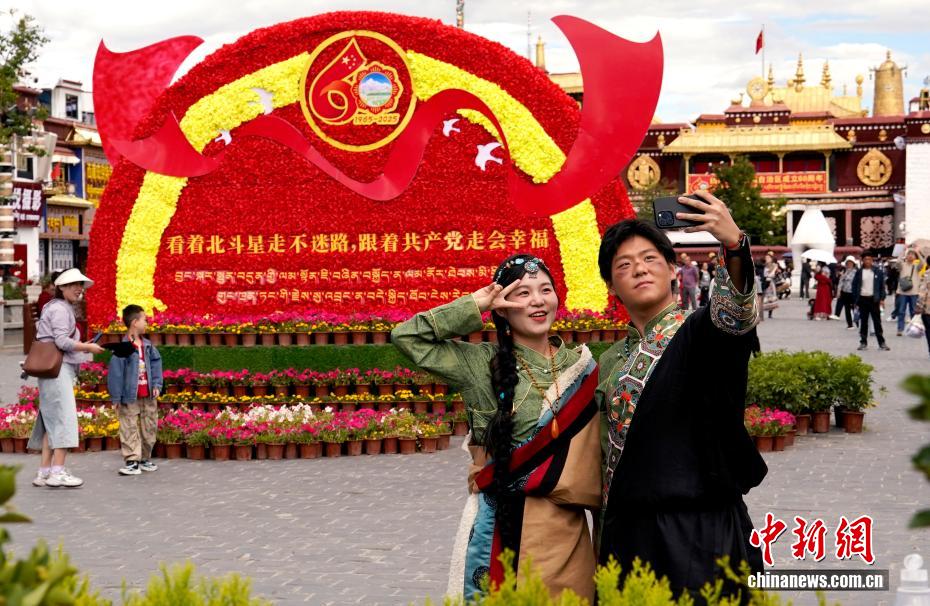 8月19日,隨著西藏自治區(qū)成立60周年慶?;顒?dòng)臨近,拉薩氛圍濃。拉薩街頭,處處是張燈結(jié)彩的盛景,洋溢著一派祥和與歡騰的氛圍。圖為游客在拉薩大昭寺廣場(chǎng)上的大慶宣傳標(biāo)語(yǔ)前留念。旦增卓瑪 攝