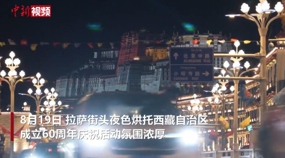 8月19日,拉薩街頭夜色烘托西藏自治區(qū)成立60周年慶?;顒臃諊鷿夂?。隨著西藏自治區(qū)成立60周年慶?;顒优R近,拉薩街頭彩旗飄揚、人行天橋裝扮一新、燈光秀炫彩奪目,處處洋溢著一派祥和歡慶的氣氛。(李林 旦增卓瑪 制作 王嘉怡)