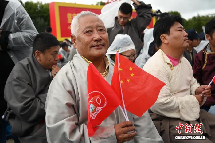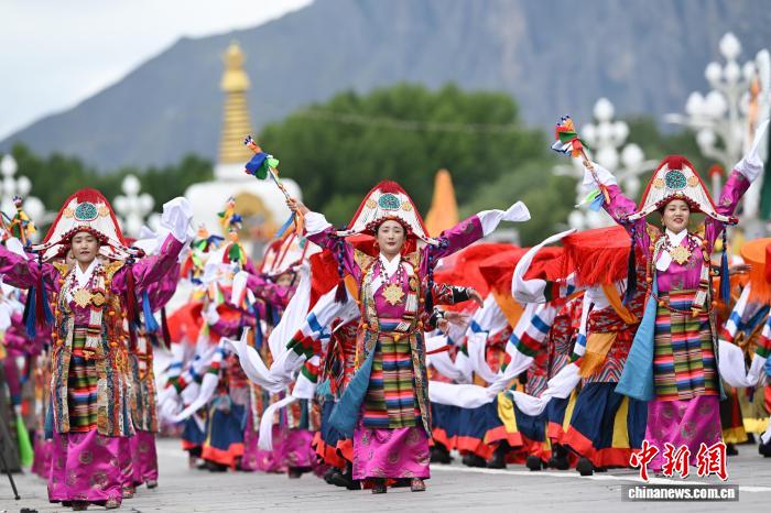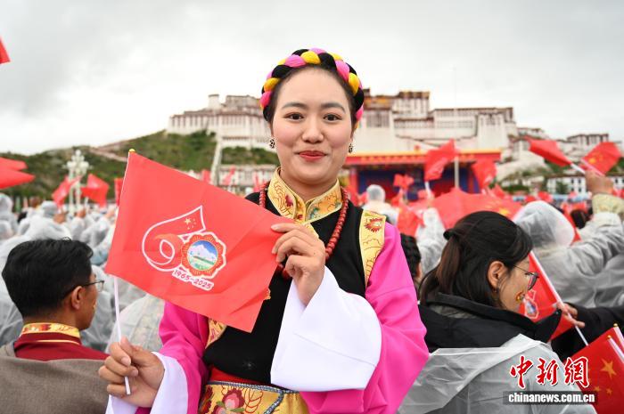 8月21日,拉薩古城居民羅桑群佩在布達(dá)拉宮廣場參加慶祝活動。中新社記者 趙朗 攝