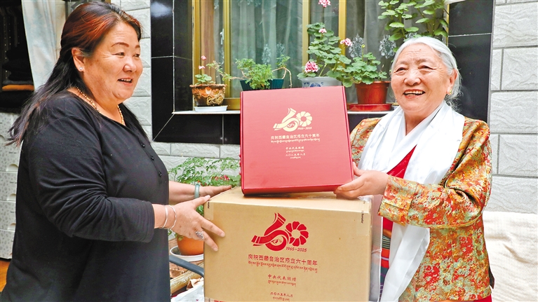 圖為卓瑪仁增(右)收到了中央代表團(tuán)贈送的禮品。記者 盧文靜 格桑倫珠 攝