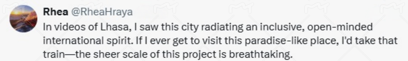 網(wǎng)友@Rhea表示,“在拉薩的視頻中,我看到這座城市散發(fā)著包容、開(kāi)放的國(guó)際精神。如果我有機(jī)會(huì)參觀這個(gè)天堂般的地方,我會(huì)坐那列火車(chē)——這個(gè)項(xiàng)目(青藏鐵路)的規(guī)模令人嘆為觀止?!?/p>
