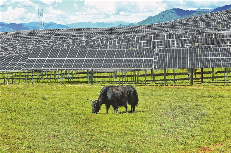 熱瓦鄉(xiāng)熱熱村是典型的牧業(yè)村,位于那曲市索縣的群山峻嶺之間。2023年12月,西藏開投集團(tuán)投資建設(shè)的50MW牧光互補(bǔ)儲能項(xiàng)目在這里并網(wǎng)發(fā)電,遠(yuǎn)遠(yuǎn)望去像是山坡上的“藍(lán)色湖泊”。牧民們每天會趕著羊群來這里放牧,陽光透過光伏板的縫隙灑在草地上,羊群在陰涼下自由覓食。在光伏板的“庇護(hù)”下,不僅山地植被可以免受烈日大風(fēng)的侵襲,還能對養(yǎng)殖的動物起到保護(hù)效果,在充分利用光能優(yōu)勢的同時,為鄉(xiāng)村振興注入新動能,實(shí)現(xiàn)企業(yè)和農(nóng)牧民雙向受益。