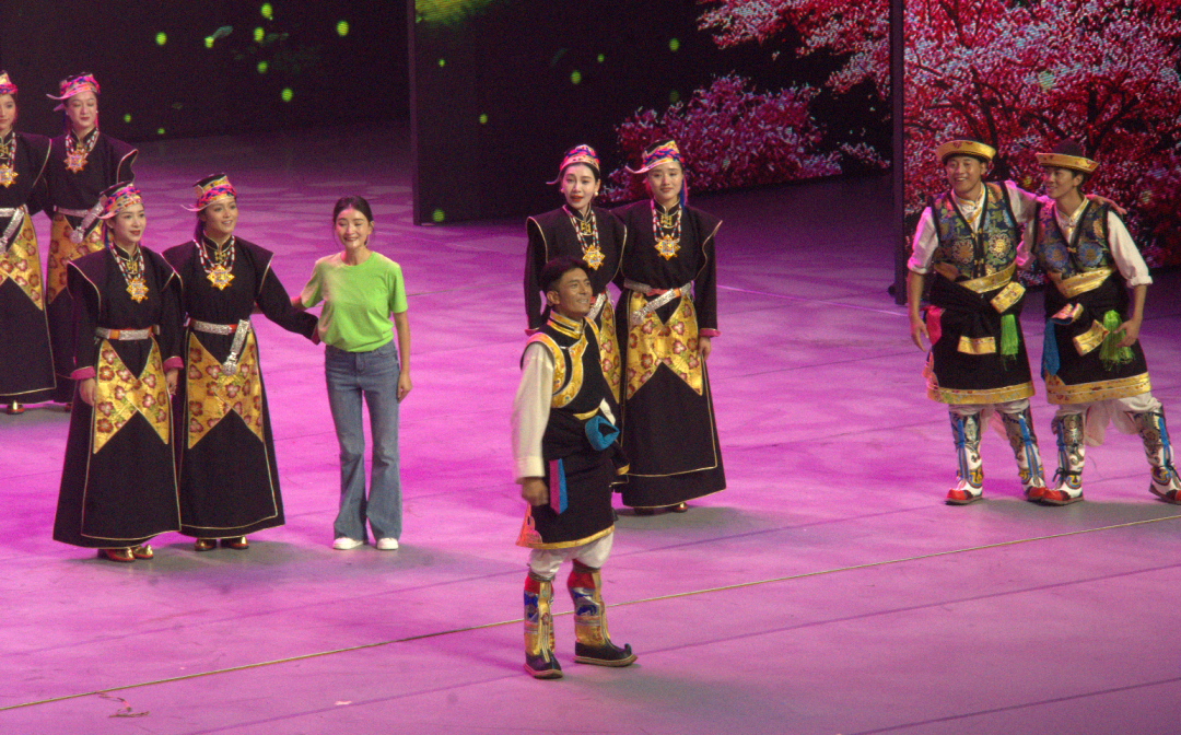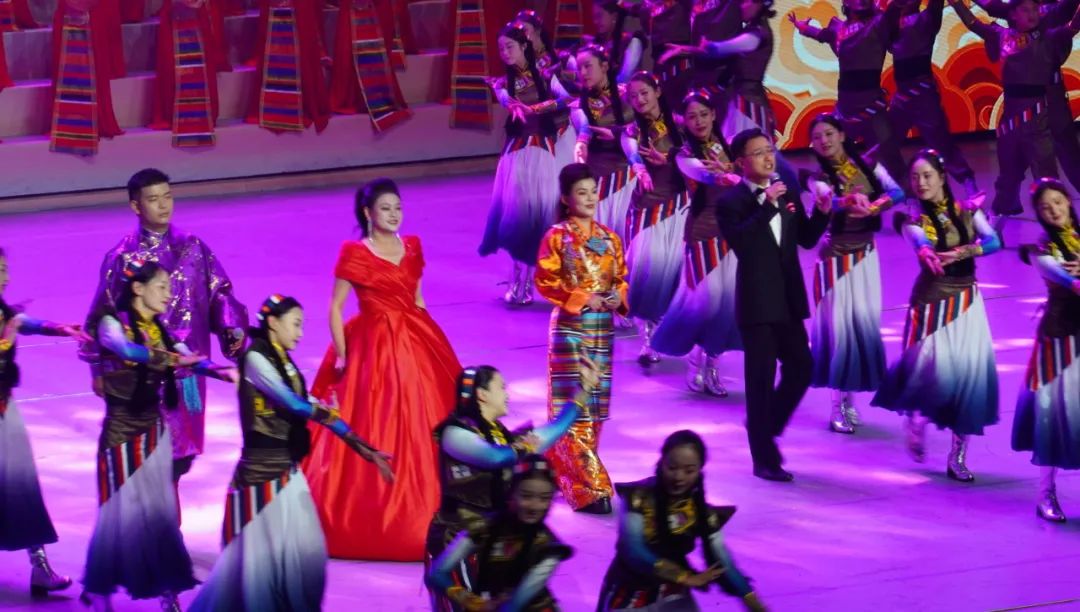 中篇則聚焦改革開放帶來的變革,情境歌舞《奔跑的高原》用充滿活力的編排展現(xiàn)雪域高原的蓬勃生機,歌曲聯(lián)唱《家鄉(xiāng)美》以熟悉的旋律喚起觀眾對家鄉(xiāng)發(fā)展的共鳴,配樂講述《厚愛》更是以溫情筆觸傳遞黨和國家對西藏的關懷。紅濤導演強調(diào):“這一篇章的關鍵是‘變’,我們要讓觀眾直觀感受到改革開放如何為西藏注入新活力,讓高原從傳統(tǒng)走向現(xiàn)代,從封閉走向開放?!?/p>