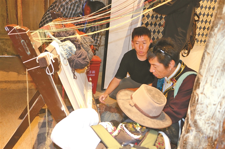 圖為網(wǎng)絡達人參觀拍攝傳統(tǒng)手工藏毯織造機器。
