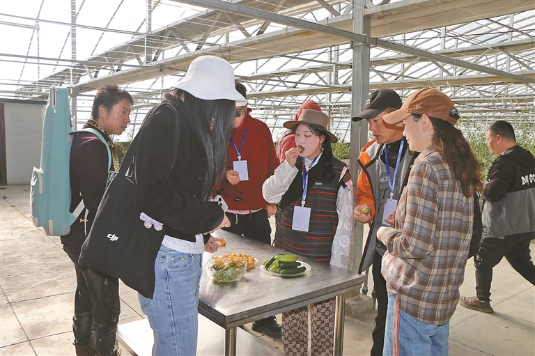 圖為網(wǎng)絡達人在瓊結縣菜籃子基地參觀拍攝。