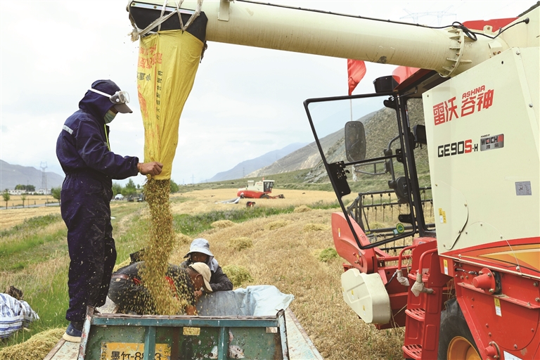 金秋十月,墨竹工卡縣的田野被染成金色,一年一度的秋收大幕正式拉開。田間地頭,大型收割機(jī)穿梭作業(yè),村民們緊隨其后,臉上滿是豐收的喜悅,勾勒出一幅“糧滿倉、人歡笑”的美麗秋收畫卷。