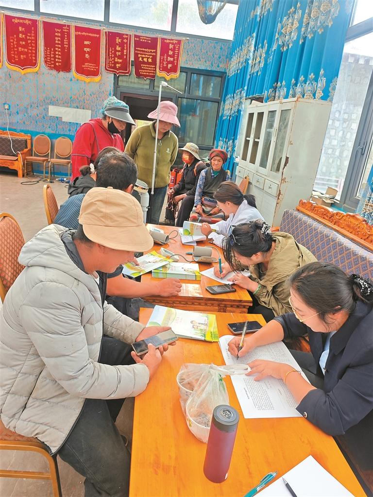 “五彩梅朵·曲水心橋”志愿服務(wù)隊(duì)耐心為村民組長(zhǎng)講解政策。