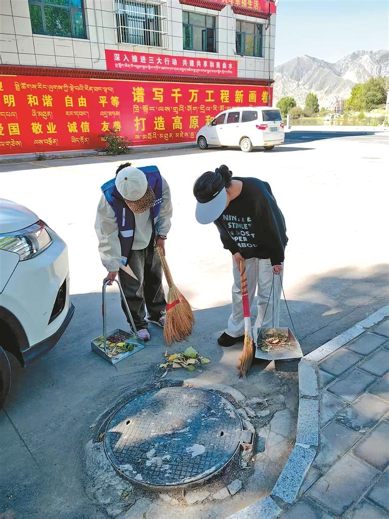 “鄰里守望·阿佳行動(dòng)”志愿者在打掃轄區(qū)衛(wèi)生。