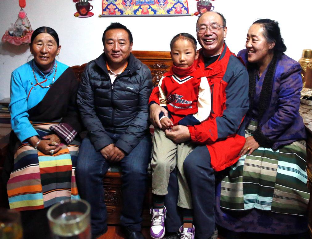 這是唐召明(右二)作為北京建藏援藏工作者協(xié)會(huì)志愿者到藏北草原向牧民群眾捐贈(zèng)撿拾牛糞的高原撿拾車(chē)時(shí),前去看望次仁石達(dá)(左二)一家,并與次仁石達(dá)的女兒小拉姆(中)以及阿媽達(dá)曲(左一)合影留念(王博軒2019年9月9日攝)