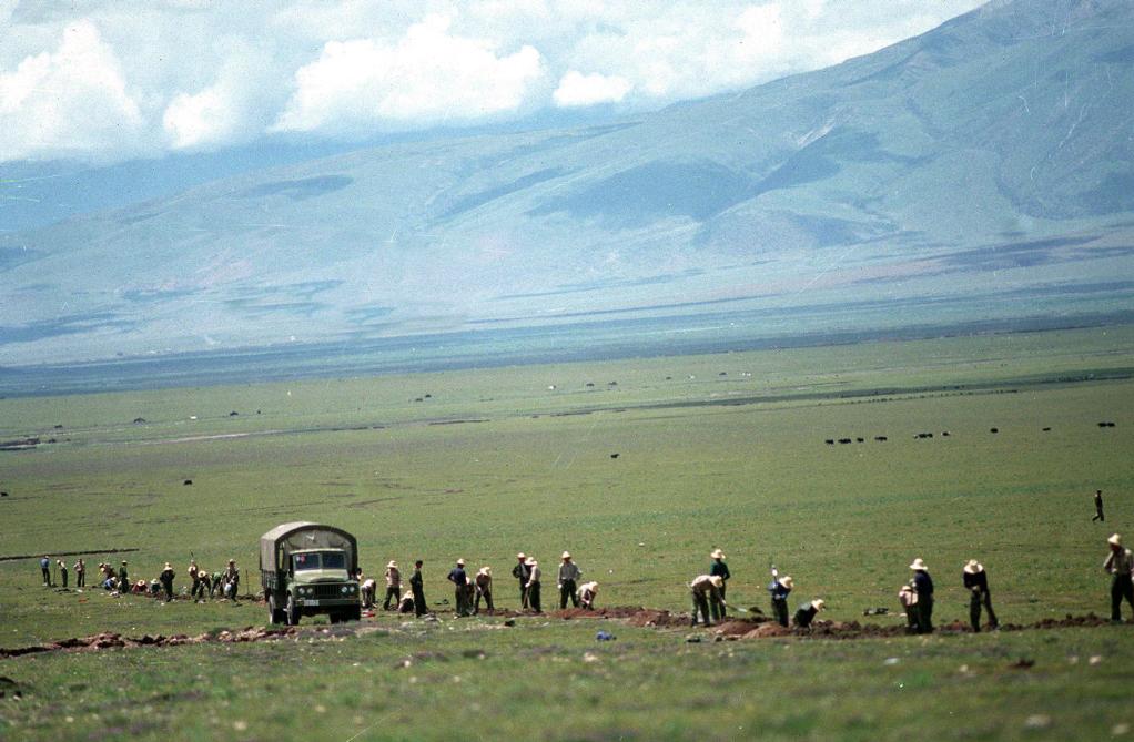 蘭州——西寧——拉薩光纜工程,從1997年7月開(kāi)始施工。這是工人和駐藏部隊(duì)官兵在海拔4000多米的藏北草原上準(zhǔn)備鋪設(shè)光纜的情景。(1997年9月18日發(fā))