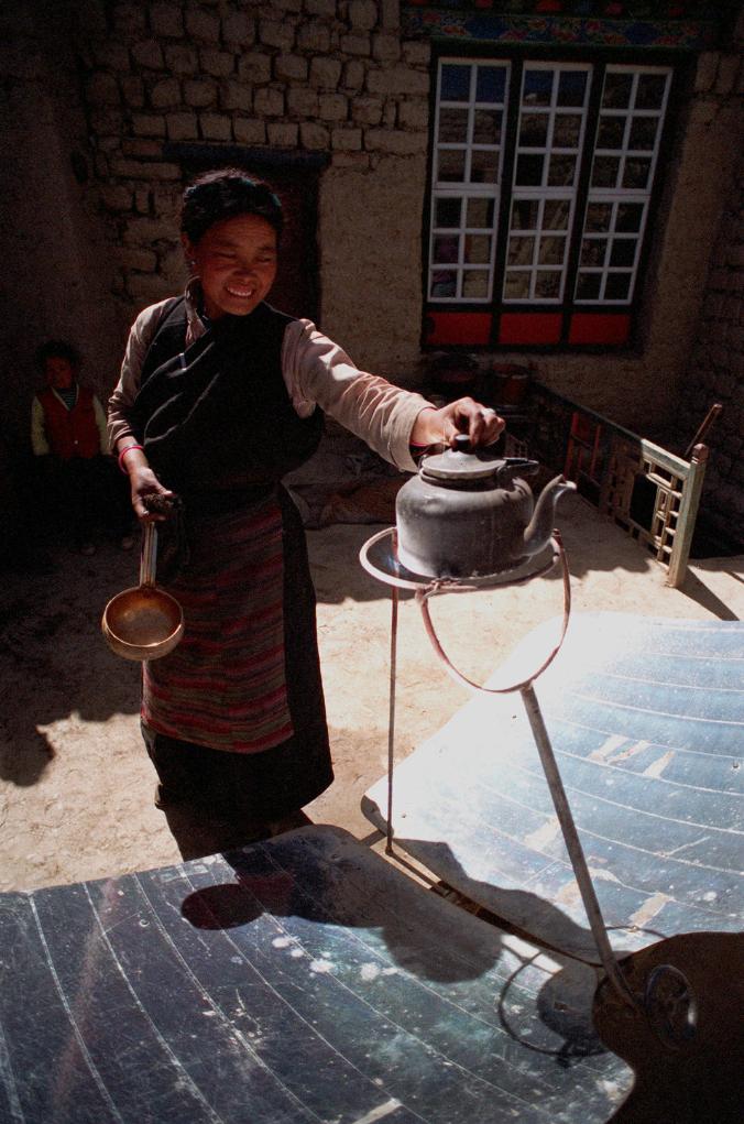 西藏江孜縣,次仁玉珍使用太陽(yáng)能灶燒開(kāi)水。這種太陽(yáng)能灶十多分鐘就可以燒開(kāi)一壺水,既省時(shí)、省力,又方便。 (1997年10月13日發(fā))