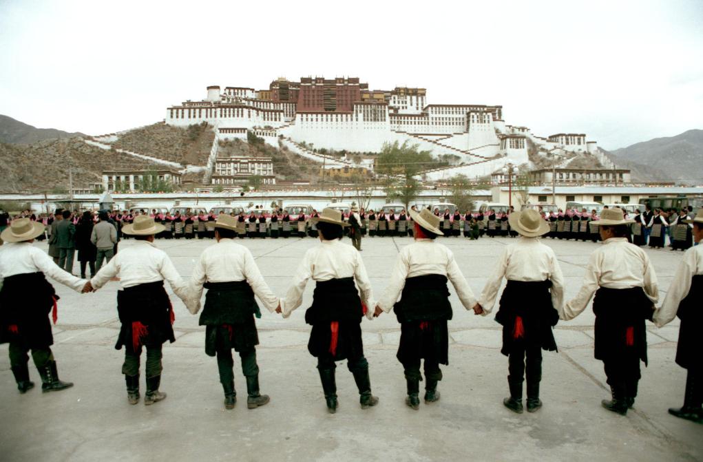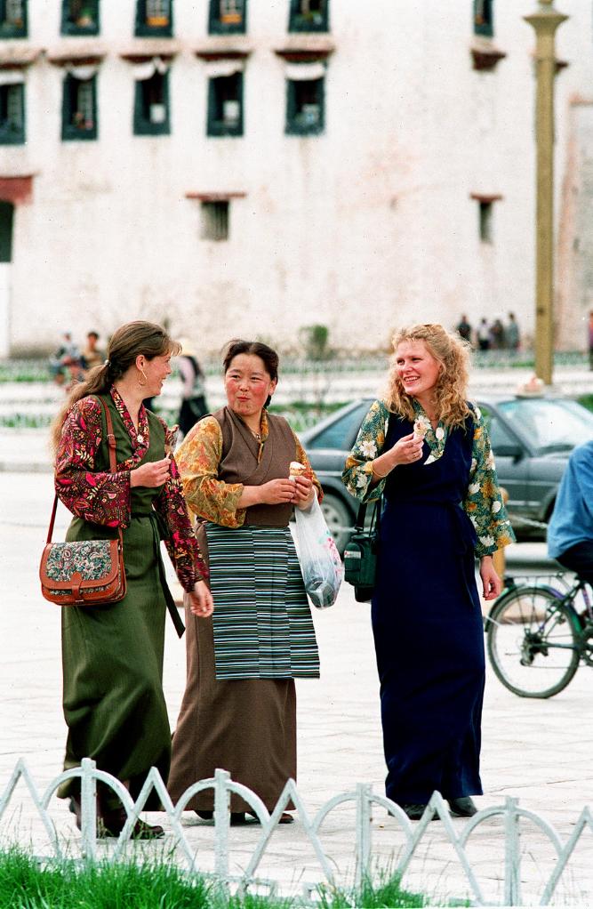 在拉薩市布達(dá)拉宮前,兩位身著藏裝的外國(guó)游客和一位藏族婦女交談。交通和旅游服務(wù)設(shè)施的逐步完善,為獨(dú)具風(fēng)情的西藏高原引來(lái)了更多的游客。(1997年11月13日發(fā))
