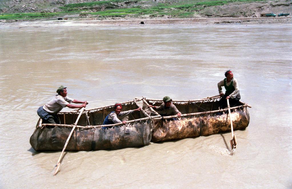 雅魯藏布江上擺渡的牛皮筏。這是在西藏常見(jiàn)的一種水上運(yùn)輸工具,用幾張整牛皮縫在一起制成。(1997年11月28日發(fā))