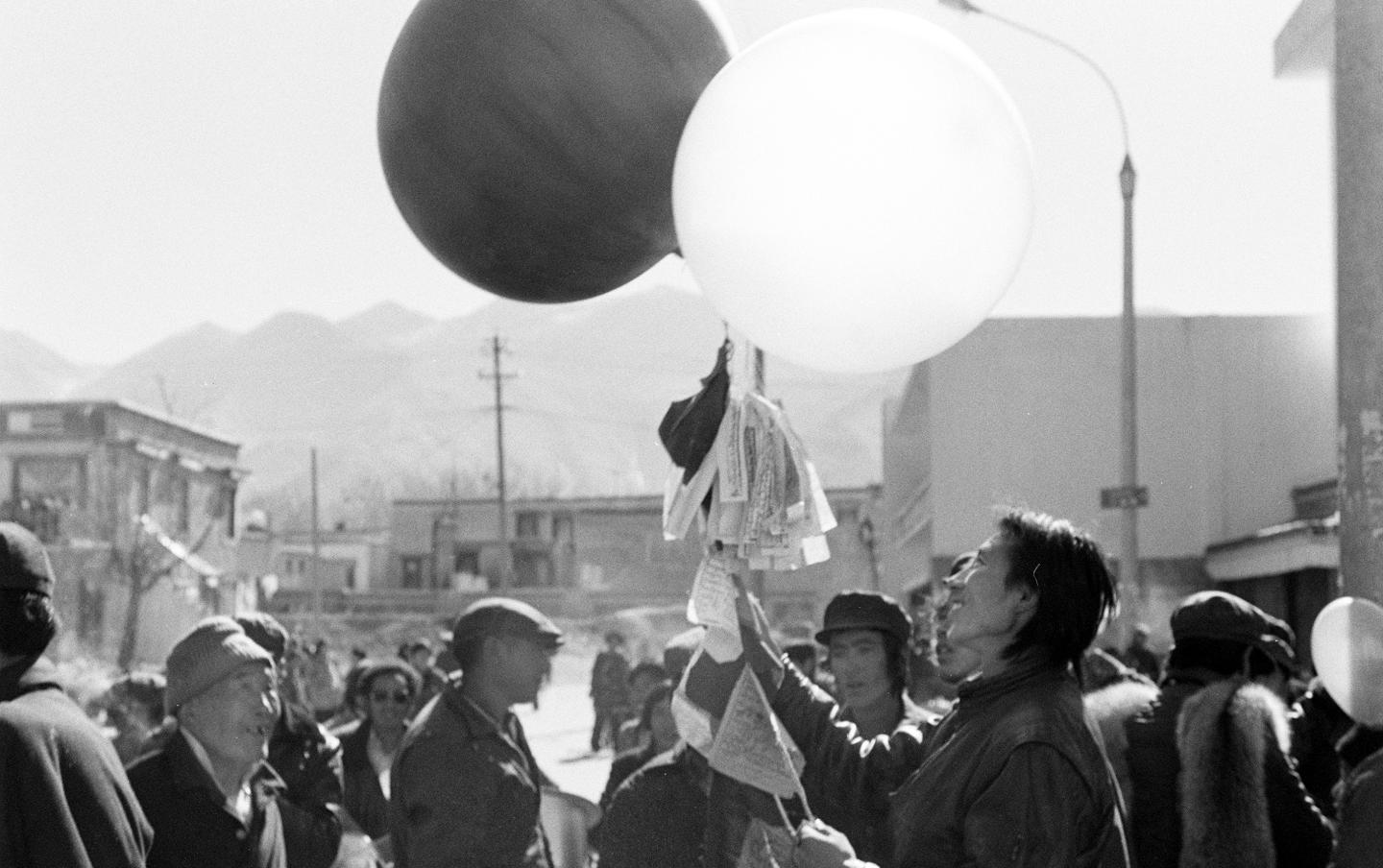 1989年新年伊始,拉薩市街頭出現(xiàn)了賣(mài)大氣球的個(gè)體戶,藏族市民喜歡將經(jīng)幡掛在彩色氣球下,放飛空中。