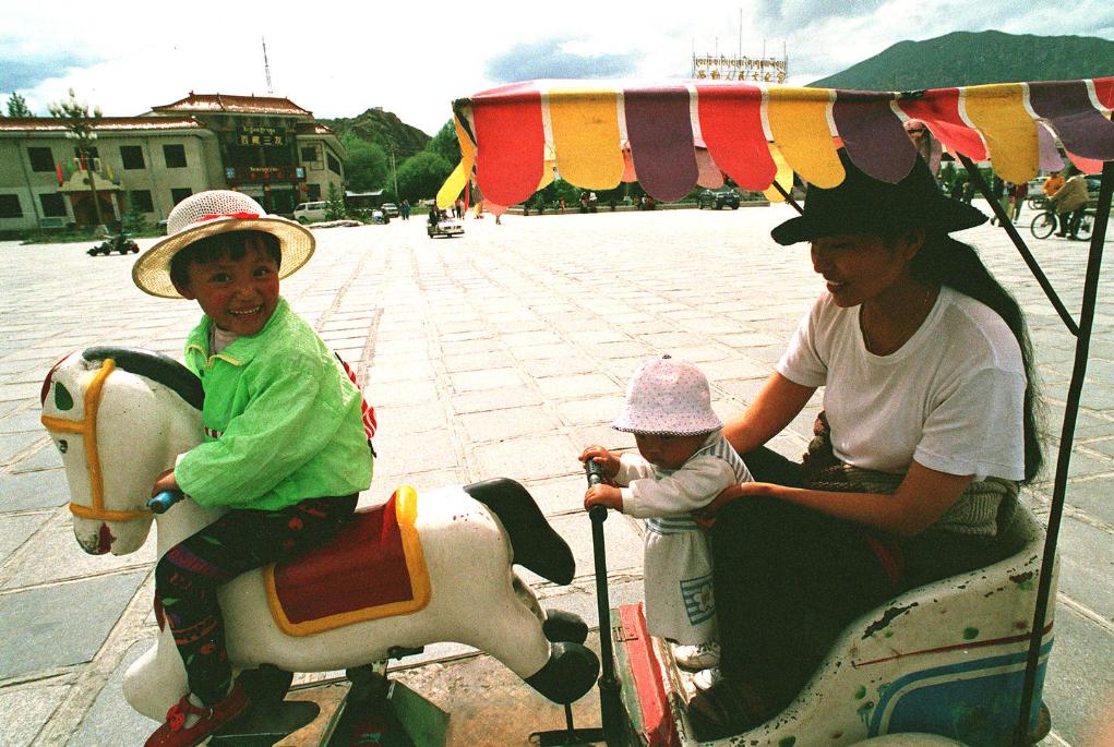 在拉薩市布達(dá)拉宮廣場(chǎng),這家藏族母女三人在乘坐兒童電動(dòng)車(chē)游玩娛樂(lè)(1997年11月13日發(fā))。