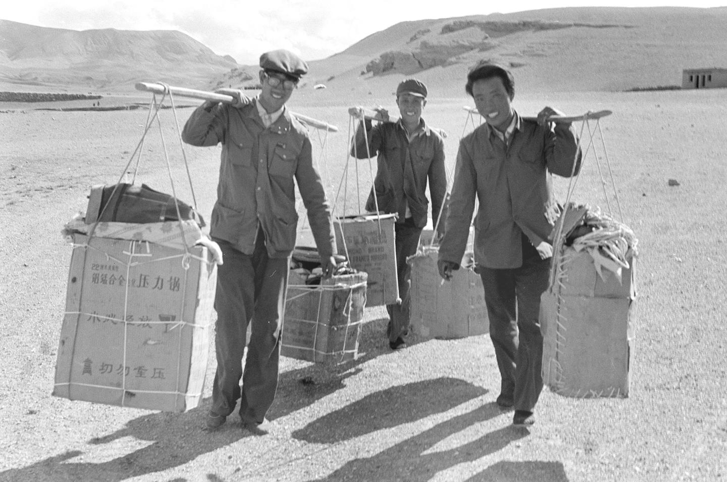 隨著“無(wú)人區(qū)”的開(kāi)發(fā)建設(shè),在這亙古荒原迎來(lái)了內(nèi)地貨郎擔(dān)。這是來(lái)自甘肅省秦安縣興豐鄉(xiāng)的三位農(nóng)民肩挑商品來(lái)到海拔5000米的文部草原出售商品(1987年9月16日發(fā))。
