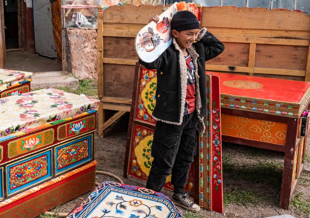 雙湖縣多瑪鄉(xiāng)仲魯瑪村的一個(gè)小朋友拿著自己心愛(ài)的滑板,準(zhǔn)備搬去新家(2022年7月13日攝)。新華社記者 孫非 攝