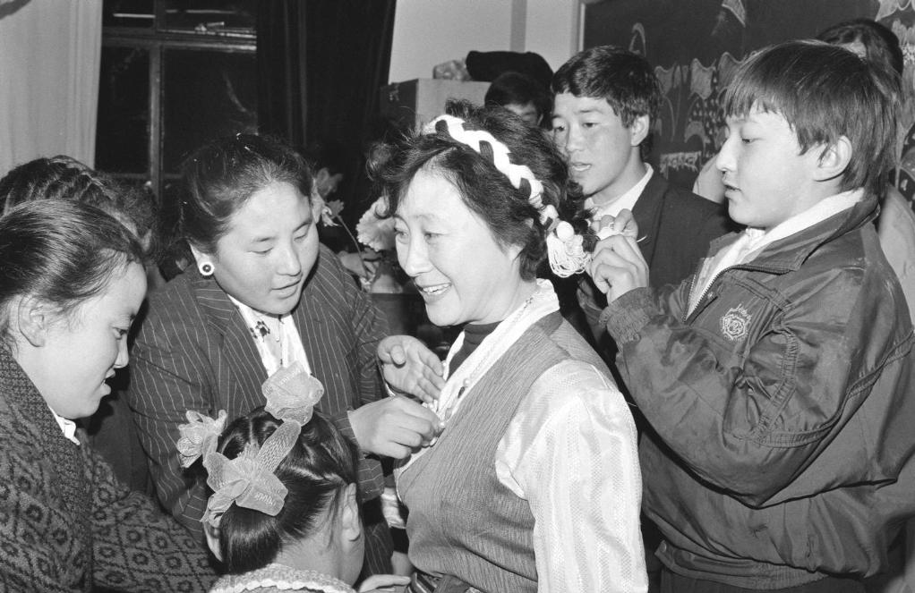 北京市西藏中學(xué)600多名高原兒女歡度藏歷水猴年新春佳節(jié)。預(yù)科二班的藏族中學(xué)生給他們的“張媽媽”——班主任張榮安老師穿上藏裝,共慶這歡樂(lè)時(shí)刻(1992年3月5日攝)。