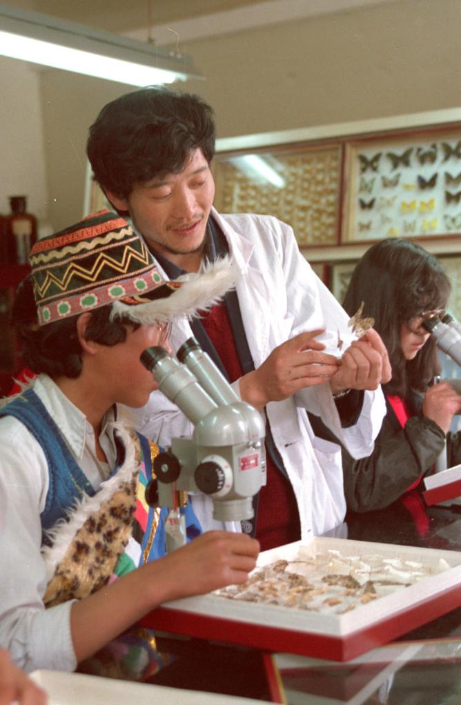 西藏農(nóng)牧學(xué)院農(nóng)學(xué)系老師在輔導(dǎo)藏族學(xué)生觀察蝴蝶昆蟲(chóng)標(biāo)本。(1991年發(fā))