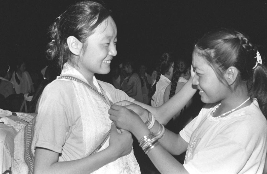 北京西藏中學(xué)首批93名藏族高中畢業(yè)生乘火車(chē)離京返藏。1991年入校的次仁卓嘎來(lái)到北京火車(chē)站為姐姐卓嘎送行。卓嘎是位品學(xué)兼優(yōu)的好學(xué)生。臨別前,她勉勵(lì)妹妹好好學(xué)習(xí)(1992年7月13日攝)。
