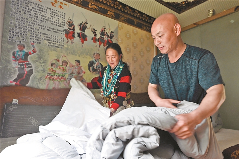 米林市南伊珞巴民族鄉(xiāng),亞達(dá)兒與丈夫鄭定全在整理民宿房間。記者 白瑪澤旺 攝