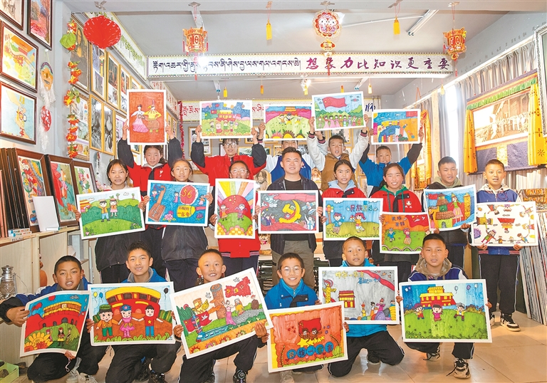 山南市桑日縣中學(xué)美術(shù)興趣社團(tuán)的學(xué)生展示自己的以“鑄牢中華民族共同體意識”為主題的繪畫作品。記者 洛桑 通訊員 次仁龍布 攝