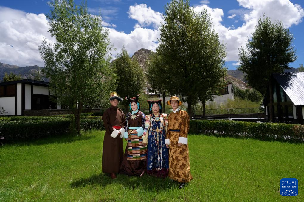 班珠丹塔(右一)和模特合影留念,模特們穿著由他設計的藏裝(9月9日攝)。新華社記者 張笑宇 攝??