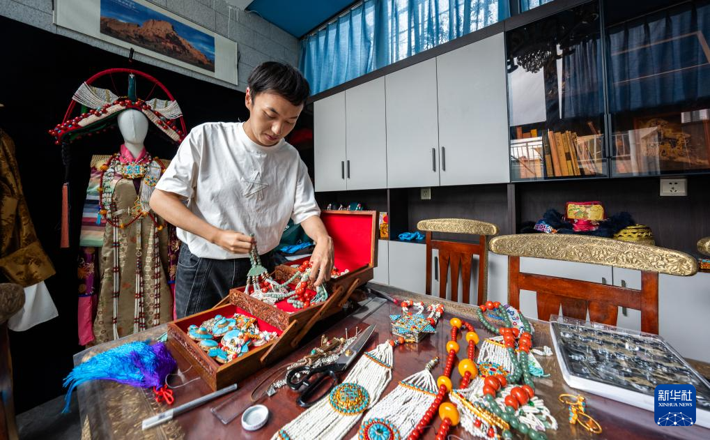 班珠丹塔在家中工作室內整理自己做的藏式配件(9月11日攝)。新華社記者 丁增尼達 攝?