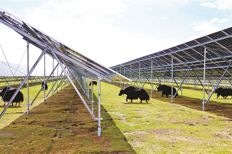 在華電羅布沙光伏項(xiàng)目區(qū),整齊的光伏板陣列與圣潔的雪山共同構(gòu)成獨(dú)特景致。光伏板下,回鋪的草甸悄然復(fù)蘇,牦牛悠然其間覓食,形成獨(dú)特的“牧光互補(bǔ)”模式,實(shí)現(xiàn)了生態(tài)保護(hù)與清潔能源生產(chǎn)的雙贏。