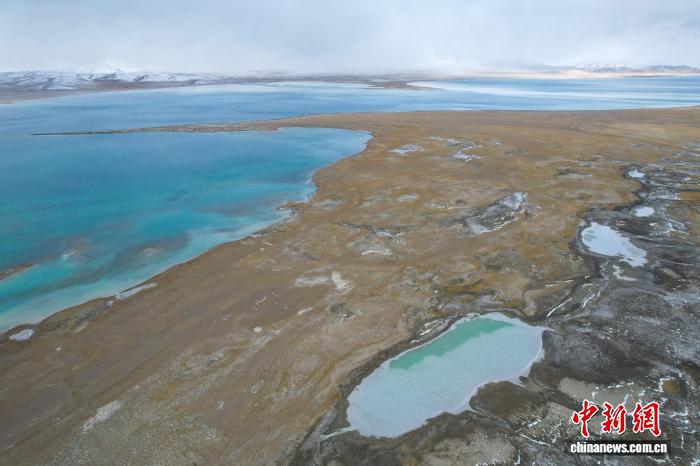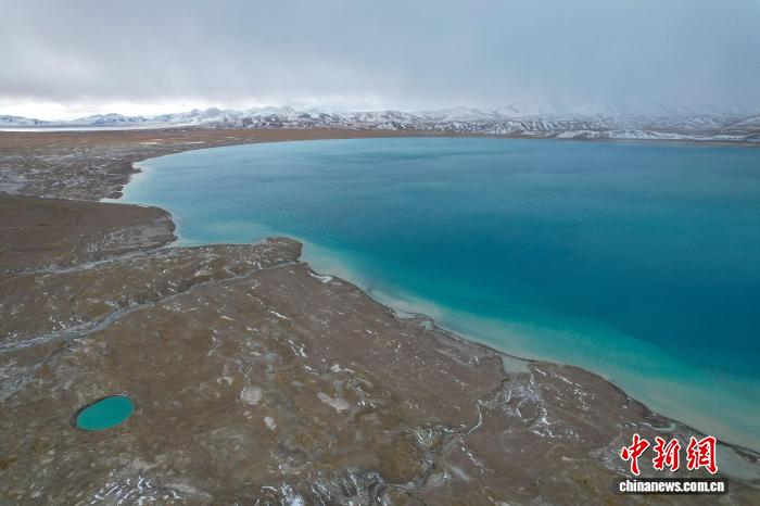 圖為10月9日,航拍視角下,美馬錯(cuò)湖水顏色漸次變化,遠(yuǎn)處雪山隱隱。江飛波 攝