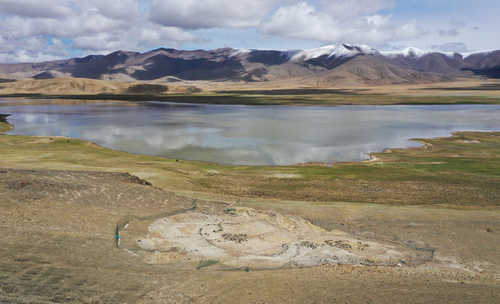 這是2025年5月22日拍攝的坐落在瑪不錯(cuò)湖畔的遺址第四期石構(gòu)地面建筑考古發(fā)掘現(xiàn)場(無人機(jī)照片)。新華社記者 李賀 攝