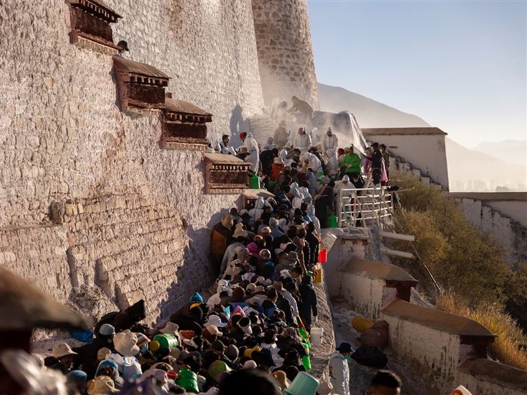 “喝個熱茶再繼續(xù)干吧?!苯衲?1歲的次珍來自拉薩市墨竹工卡縣,她當(dāng)天早上6點就從家里出發(fā),終于趕上了第一波刷墻。“我雖然住在拉薩,但七十多年了,今天還是第一次來布達拉宮刷墻,感覺人生已經(jīng)沒有什么遺憾了?!贝握渑踔鵁釟怛v騰的酥油茶,笑著說道。