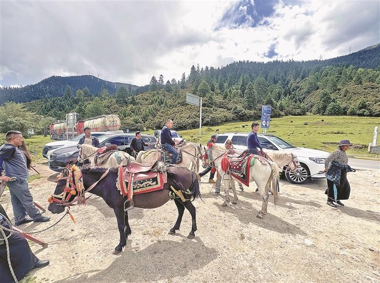 林芝市魯朗景區(qū)內,游客在體驗當?shù)靥厣T馬項目。 記者 白瑪澤旺 攝