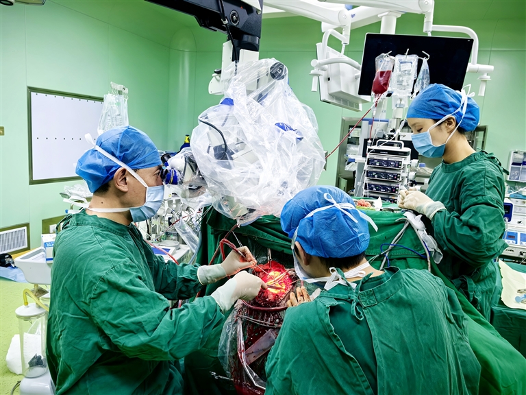 手術(shù)當日,在麻醉科和手術(shù)室護士團隊的密切配合下,由郝強主刀,單永炳、付永鵬擔任助手,為患者實施了手術(shù)。術(shù)中,郝強在顯微鏡下仔細分離腫瘤周邊的重要血管,最大程度保護周邊腦組織不受損傷,如同在生命禁區(qū)里仔細操作。術(shù)中一次性完整切除位于不同腦葉的3枚腫瘤,由于腦膜上散在多枚微小腦膜瘤,遂將侵犯腦膜一同切除。手術(shù)過程順利,患者恢復(fù)良好。術(shù)后復(fù)查頭顱MRI顯示,顱內(nèi)腫瘤已完全消失,無殘留。目前患者積極康復(fù)治療,將擇期出院。