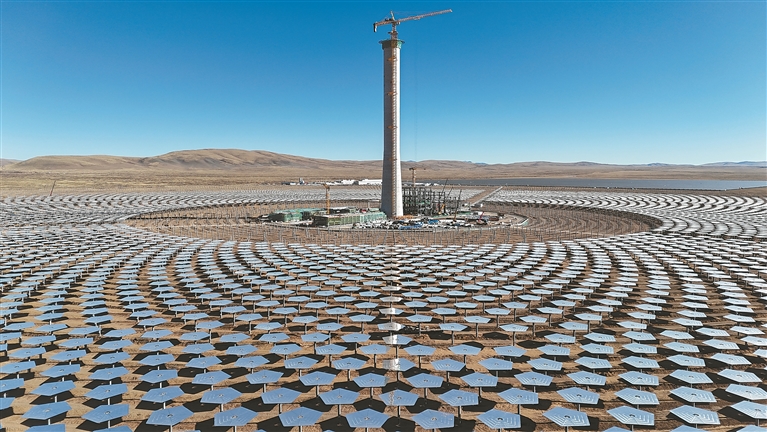 記者在施工現(xiàn)場了解到,該吸熱塔配置近1.6萬臺定日鏡,總采光面積超80萬平方米,工人正在緊張有序安裝,計劃于明年3月搭建完畢,塔頂吸熱器擬于明年4月安裝完成。屆時一座座五邊形的定日鏡,就像草原上的一朵朵“向日葵”,實時追蹤太陽位置,將陽光反射至中央吸熱塔,呈現(xiàn)“萬鏡朝陽、塔耀雪山”的壯麗景象,如同科幻電影里的場景,成為藏北高原上一座“亮眼”的綠色能源地標。