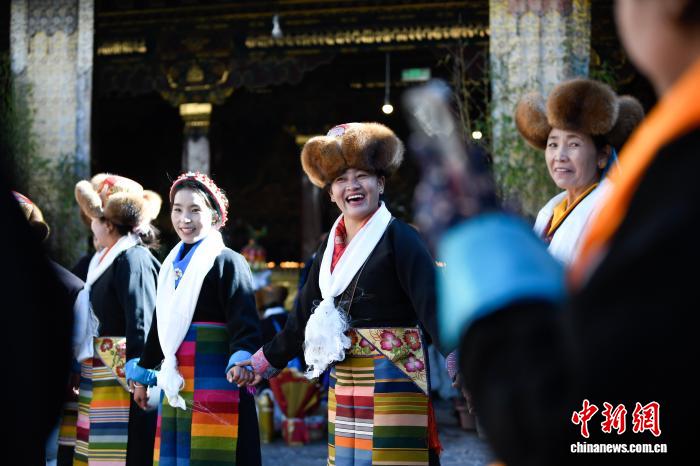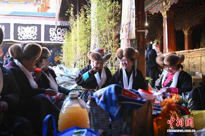 隨著藏歷十月十五白拉姆節(jié)(又稱“仙女節(jié)”)臨近,11月28日,西藏拉薩的婦女們在大昭寺互敬青稞酒,迎接“仙女節(jié)”到來?!跋膳?jié)”即吉祥天母節(jié),藏語稱“白來日追”。相傳藏傳佛教最高護法神之一班丹拉姆的女兒白拉姆,不顧母親的反對與赤尊贊私定終身,班丹拉姆一怒之下將赤尊贊趕到拉薩河南岸,規(guī)定二人僅每年的藏歷十月十五日相見。中新社記者 貢嘎來松 攝