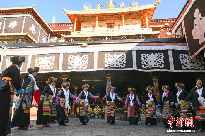 隨著藏歷十月十五白拉姆節(jié)(又稱“仙女節(jié)”)臨近,11月28日,西藏拉薩的婦女們在大昭寺跳起傳統(tǒng)舞蹈,迎接“仙女節(jié)”到來?!跋膳?jié)”即吉祥天母節(jié),藏語稱“白來日追”。相傳藏傳佛教最高護法神之一班丹拉姆的女兒白拉姆,不顧母親的反對與赤尊贊私定終身,班丹拉姆一怒之下將赤尊贊趕到拉薩河南岸,規(guī)定二人僅每年的藏歷十月十五日相見。中新社記者 貢嘎來松 攝