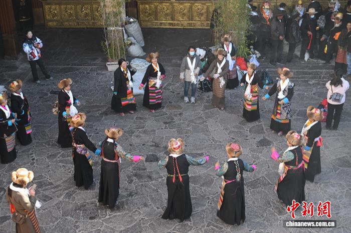 隨著藏歷十月十五白拉姆節(jié)(又稱“仙女節(jié)”)臨近,11月28日,西藏拉薩的婦女們在大昭寺跳起傳統(tǒng)舞蹈,迎接“仙女節(jié)”到來。“仙女節(jié)”即吉祥天母節(jié),藏語稱“白來日追”。相傳藏傳佛教最高護法神之一班丹拉姆的女兒白拉姆,不顧母親的反對與赤尊贊私定終身,班丹拉姆一怒之下將赤尊贊趕到拉薩河南岸,規(guī)定二人僅每年的藏歷十月十五日相見。中新社記者 貢嘎來松 攝
