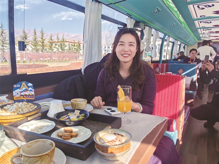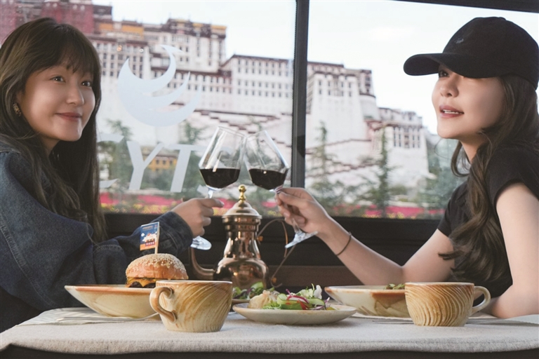 為了讓游客和市民能夠品嘗到最地道的拉薩美食,觀光巴士運營方與拉薩多家知名餐廳展開了深度合作。乘車期間,游客可以圍爐煮茶,感受那份溫馨與愜意,品嘗果茶的清甜、干果的香脆與甜品的綿密交織在口中的美妙滋味;還可以喝上一杯用高原牦牛奶與醇厚紅茶小火慢熬而成的甜茶,搭配上融合藏式元素的精致茶點,仿佛瞬間穿越到了拉薩當?shù)厝说纳钪校两襟w驗他們的悠閑午后時光。