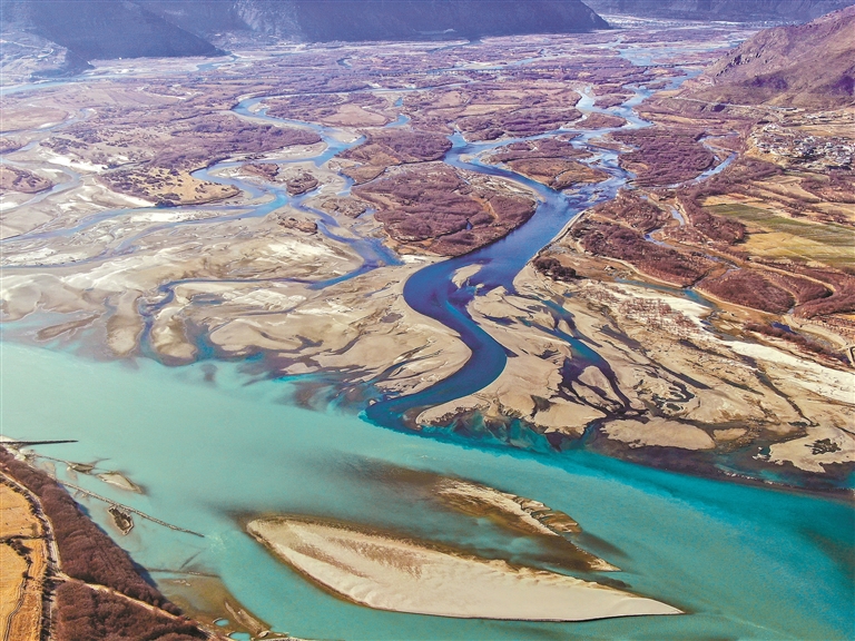 這份動人的景致,是西藏始終堅守生態(tài)保護的成果。冬季,雅魯藏布江流域降水減少,流速減緩,水體含沙量大幅降低,河床泥沙沉淀,水體澄澈度達到全年最高,加之礦物質(zhì)與水體交融,高原純凈的空氣讓陽光穿透性更強,江水的色彩層次被放大,造就了這幅江水為墨、沙洲為紙的自然畫卷。